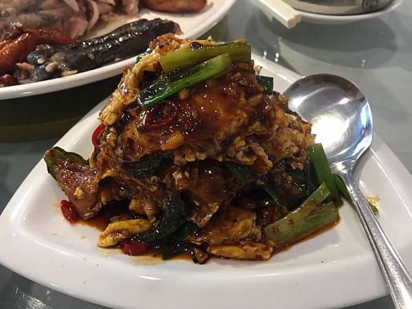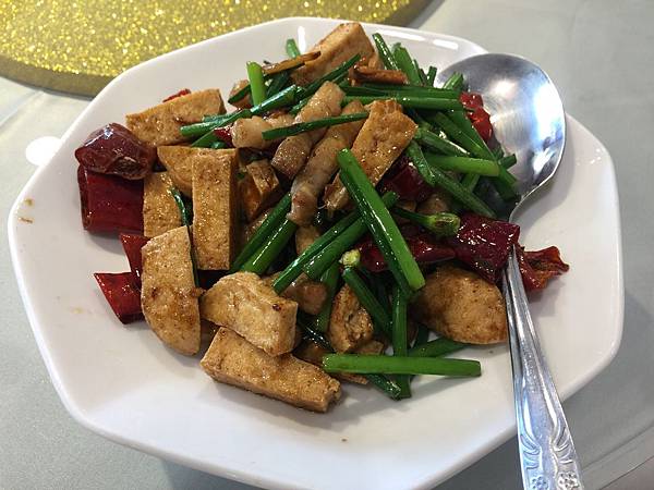臭豆腐炒肉絲與韭菜,也是完全沒有吃過的菜色,臭豆腐依舊保持了酥脆與香味,大家一口接一口,最快清光的一道菜。